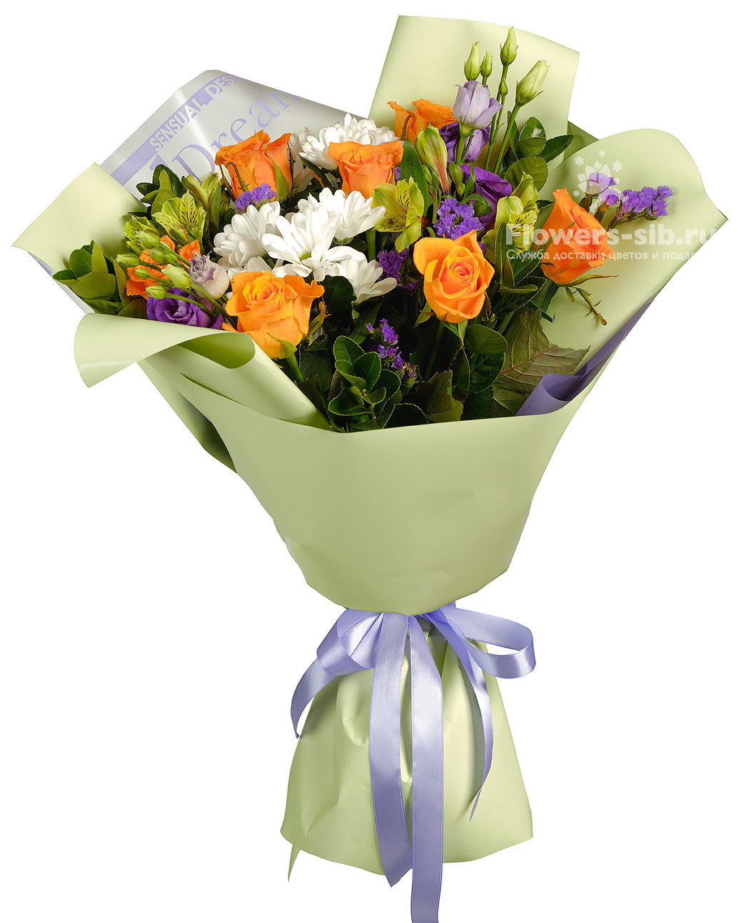 Роза - 7 шт. • Хризантема кустовая - 2 шт. • Эустома - 2 шт. • Альстромерия - 2 шт. • Статица - 1 шт. • Рускус • Упаковка